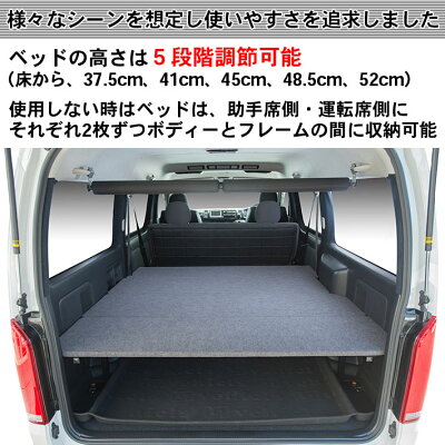 ⇒ベッドの高さは5段階調整可能 (床から、37.5cm、41cm、45cm、48.5cm、52cm) ⇒2列目シートを前に倒すとほぼフラットになります。